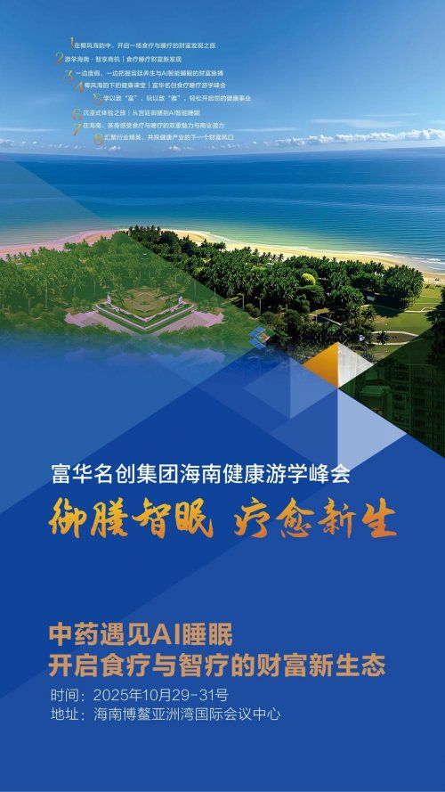 想在海南度假時,既找到創業商機,又給心靈放個假?2025年10月29-31日,富華名創集團食療睡療游學峰會在博鰲等你,新增心靈療愈板塊,帶你解鎖“邊療愈、邊賺錢”的新玩法!