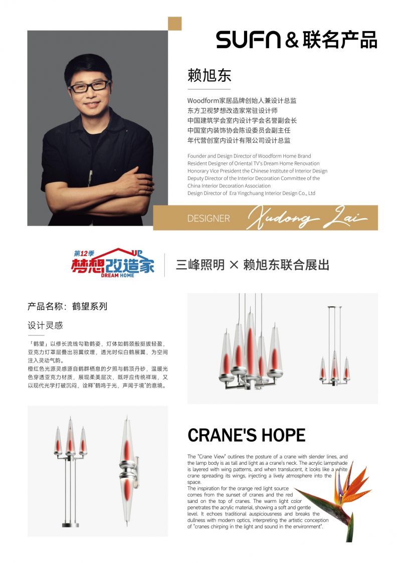 三峰照明始終將設(shè)計(jì)師聯(lián)名產(chǎn)品作為品牌發(fā)展的重要戰(zhàn)略方向之一,從早期與張建武老師跨界聯(lián)名的溯系列,到與張欣老師攜手呈獻(xiàn)的春曉系列,再到如今與賴旭東老師合作的鶴望系列,三峰照明持續(xù)與業(yè)界頂尖設(shè)計(jì)師深度合作,將設(shè)計(jì)師超前的審美理念與品牌卓越的設(shè)計(jì)落地能力相結(jié)合,為用戶帶來(lái)審美度極高的家居藝術(shù)體驗(yàn)。