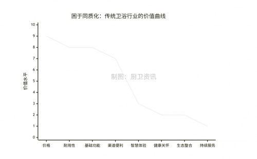 傳統(tǒng)的衛(wèi)浴制造商價(jià)值曲線,是一條隨著競爭加劇而逐漸平緩下降的曲線。其價(jià)值要素高度集中在“價(jià)格”、“耐用性”、“基礎(chǔ)功能”和“渠道便利性”上。當(dāng)所有玩家都在這些維度上進(jìn)行“軍備競賽”時(shí),行業(yè)不可避免地陷入同質(zhì)化與價(jià)格戰(zhàn)的“紅?!薄?/p>