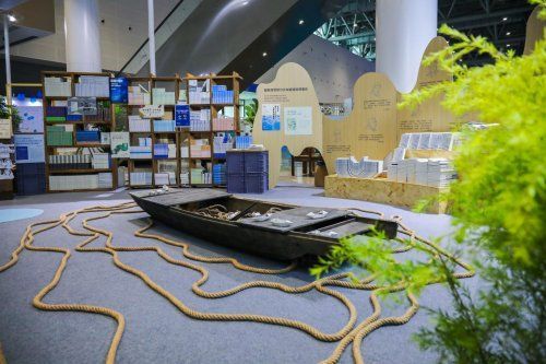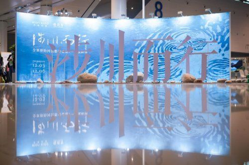 會場一隅,伊頓紀德品牌藝術展“涉川而行·全世界的河流都會重逢,一如我和你”以河流、島鏈、漣漪為核心意象,串聯起“一滴水的澄澈與明亮”“一方池塘的共生共茂”“所謂伊人,在水一方”“打開明亮的日常”四段旅程,以“文以載道”與“衣以載道”為線索,以行動致敬美好教育。