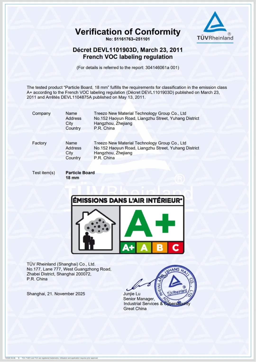 近日,千年舟抗彎力飾板(PB)憑借卓越品質(zhì),正式通過TÜV萊茵機構(gòu)權(quán)威檢測,成功取得法國A+認證(French VOC labeling regulation )!這一國際認證不僅是對千年舟環(huán)保實力的再次認可,更標志著旗下產(chǎn)品在健康家居領(lǐng)域的領(lǐng)先水平再上新臺階。