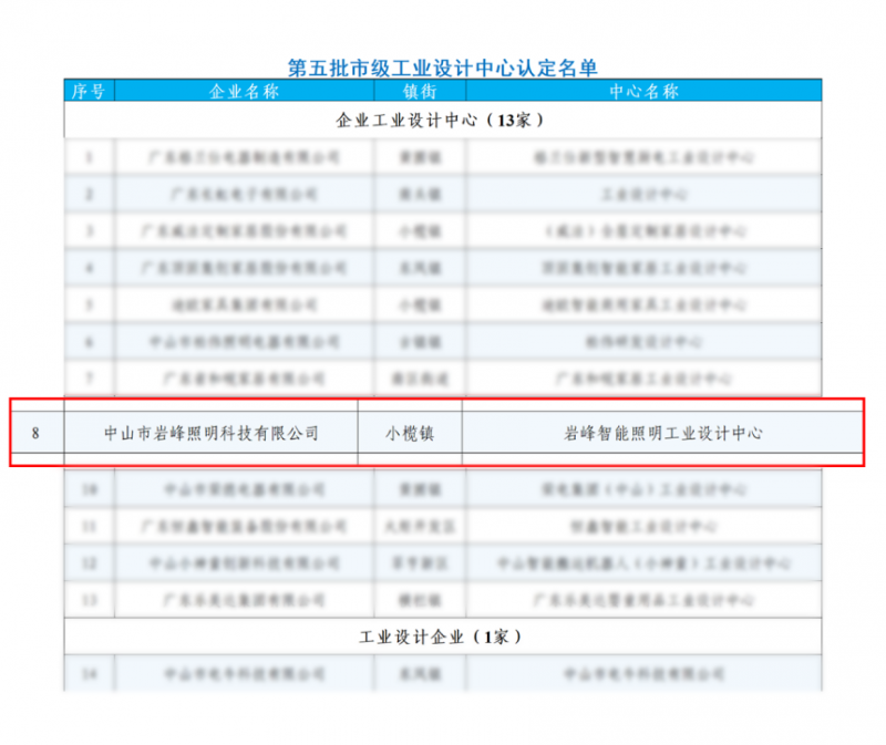 2025年12月4日,中山市工業和信息化局正式公示第五批市級工業設計中心認定名單。根據《中山市工業和信息化局關于印發中山市市級工業設計中心認定管理辦法的通知》(中工信〔2025〕116號)及相關工作要求,中山市巖峰照明科技有限公司(以下簡稱“三峰照明”)憑借卓越的設計創新能力與行業示范效應,成功躋身14家認定企業之列,掛牌為巖峰智能照明工業設計中心。