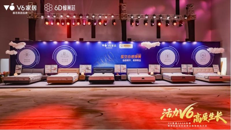 春江水暖,新品開道。作為V6家居年度開春盛事,每年的春季新品發布會都是行業內外廣泛關注的風向標事件。本次活動2026春季軟體新品發布推出了6D蜂巢芯和星空自感彈簧系列新品床墊等多款創新家居產品,覆蓋寢具、客餐廳、全屋等多種家居場景,為消費者帶來一站式生活方式解決方案。
