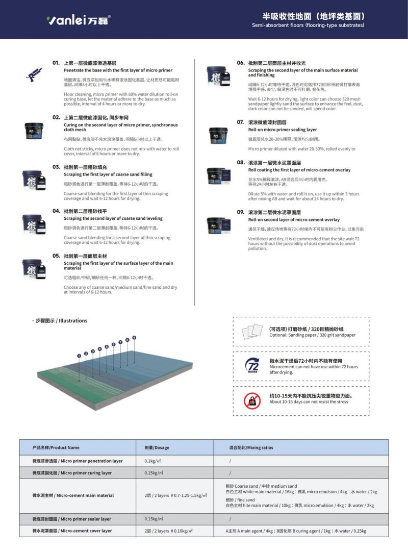 Vanlei萬磊微水泥的施工工期有明確的標準:墻面施工7-10天,地面施工10-15天。入住時間根據使用功能有所不同:墻面3天可觸摸,7天可掛物品;地面5天可行走,15天可放置重家具。