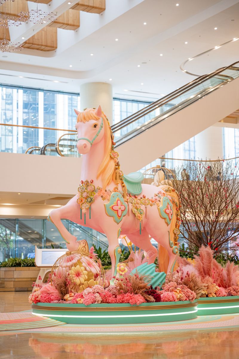 一匹3.5米高的粉彩色巨型駿馬配襯花團(tuán)錦簇與吉祥刺繡,寓意花開富貴,于桃花盛放下蓄勢奔向繁盛新歲。