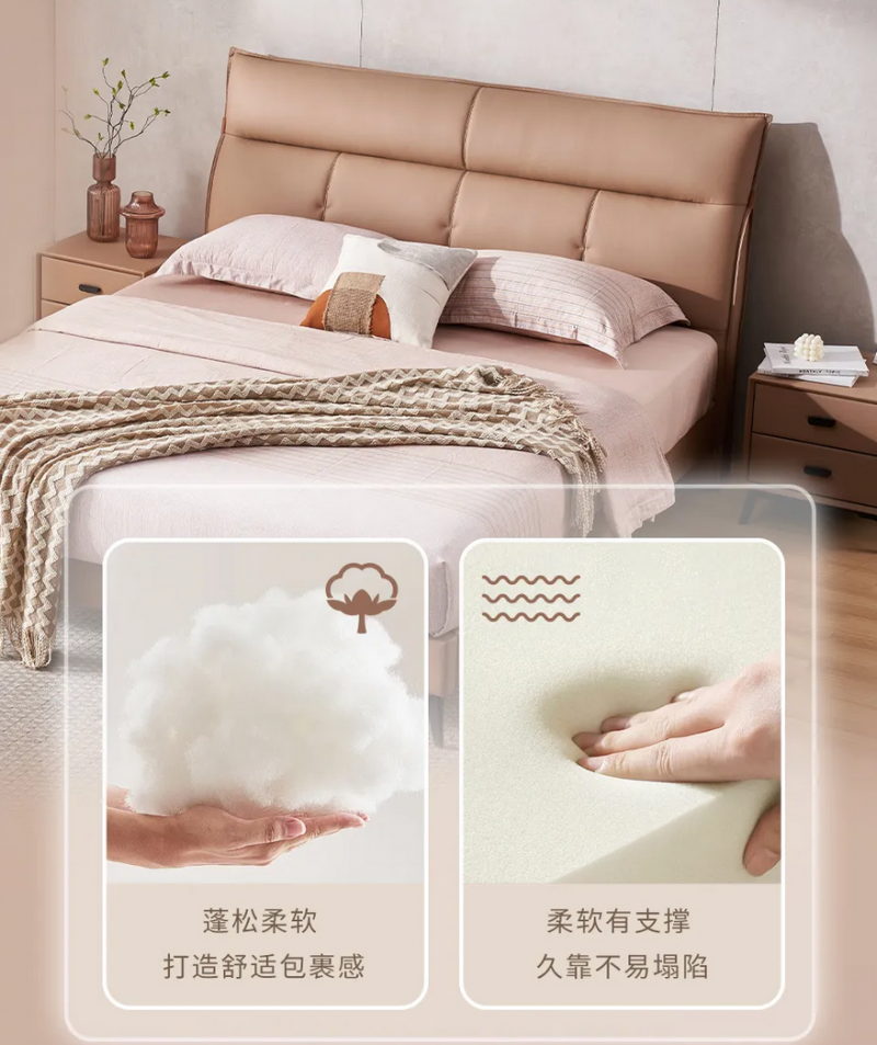 穗寶集團(tuán)梵洛貝在材質(zhì)選擇上同樣秉持嚴(yán)苛標(biāo)準(zhǔn),力求兼顧舒適觸感與長久耐用。外層選用頭層黃牛皮胚料,優(yōu)選疤痕少、皮質(zhì)緊實(shí)的優(yōu)質(zhì)皮張,最大程度還原頭層牛皮的天然肌理,讓床體外觀立體飽滿,觸感細(xì)膩溫潤。內(nèi)層創(chuàng)新填充7孔纖維棉與高密度海綿組合,兩種材質(zhì)的精妙融合,讓靠包兼具飽滿蓬松的觸感與持久回彈的特性,即便長期倚靠也不易變形塌陷,完美平衡實(shí)用性與舒適感。