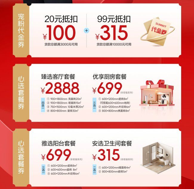 在“宇”宙寵粉季期間,薩米特為用戶精心準備了多重驚喜福利。其中,有可直接當現金使用的寵粉代金券,讓消費者購物時直接享受優惠;還有針對客廳、廚房、陽臺、衛生間等不同空間的使用需求,量身定制的心選套餐券,一站式滿足多樣化裝修需求。無論是鐘情于王安宇同款的潮流設計,還是追求極致性價比的品質之選,消費者都能在此次活動中精準鎖定自己的心頭好,真正實現“315 放心選”,輕松煥新理想家。