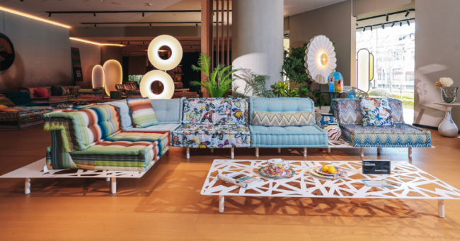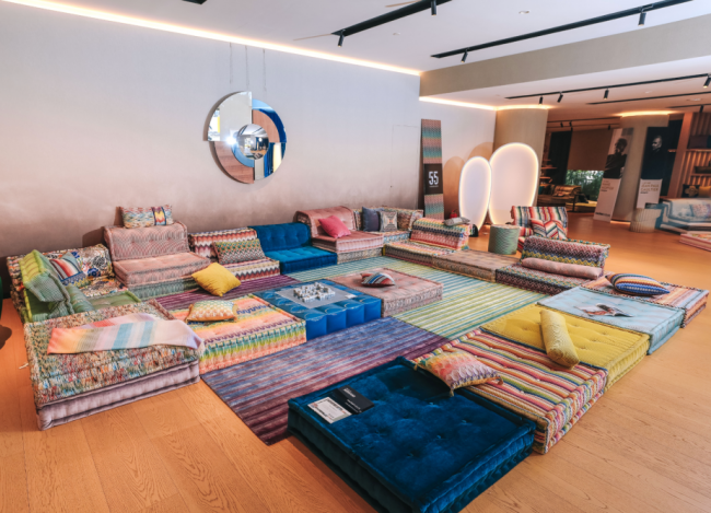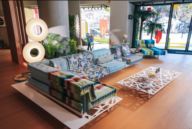 展覽現場,Mah Jong 沙發 Missoni 版還以極具創意的“貪吃蛇”式組合方式呈現:多個模塊在空間中連續蜿蜒延展,如同一條靈動游走的色彩軌跡,在開闊空間中形成流動的視覺路徑。這種頑皮布局既展現了 Mah Jong 高度自由的特性,也讓觀者在行走之間不斷發現新的空間節奏與視角。