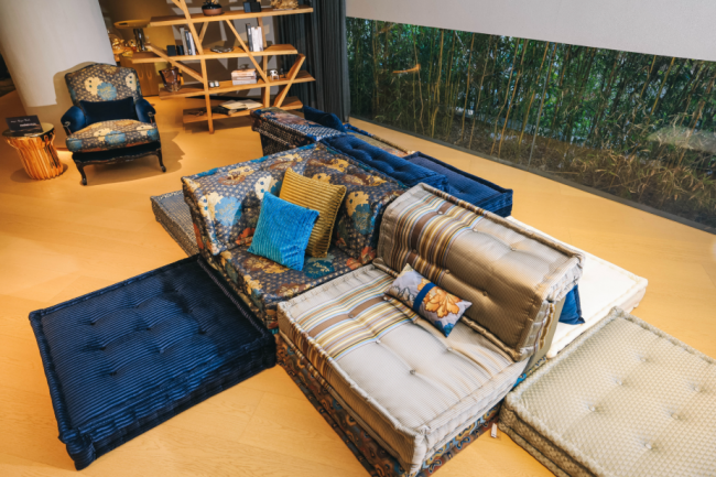 Mah Jong“麻將”沙發 Shumyu 款與時尚大師 Kenzo Takada(高田賢三)的合作版本,從傳統和服織物中汲取靈感,將花卉、幾何圖案與多層次紋理融入面料設計,在色彩交織中創造出細膩而豐沛的視覺韻律。全新織物為 Mah Jong 賦予鮮明的藝術氣質,使其能夠從容融入多元的生活場景。