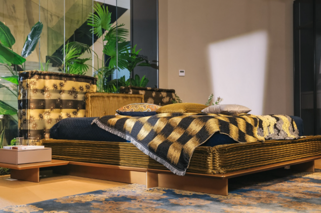 與“時尚頑童”Jean Paul Gaultier 的合作版本,則展現出另一種大膽率真的設計態度。JPG 將其標志性的水手條紋與高級時裝面料結合,為Mah Jong“麻將”沙發賦予鮮明的個性印記。現場宛如一場正在進行的時尚大片拍攝:沙發模塊與抱枕自由散落于地毯之上,與其為羅奇堡設計的其他家居單品彼此呼應,在空間中交織成一場關于時尚、設計與生活方式的對話。