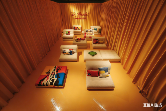行至三樓,進入阿莫多瓦的金色帷幕。這一由導演親自選定的色彩將空間塑造成沉浸式電影院。新品Lounge Pedro Almodóvar 沙發錯落散置于其間,如隨性的觀影坐席,讓觀者自然融入阿莫多瓦的電影宇宙——色彩濃烈、情緒爆滿、敘事張力十足。在此,家居已化身為承載敘事的藝術媒介。