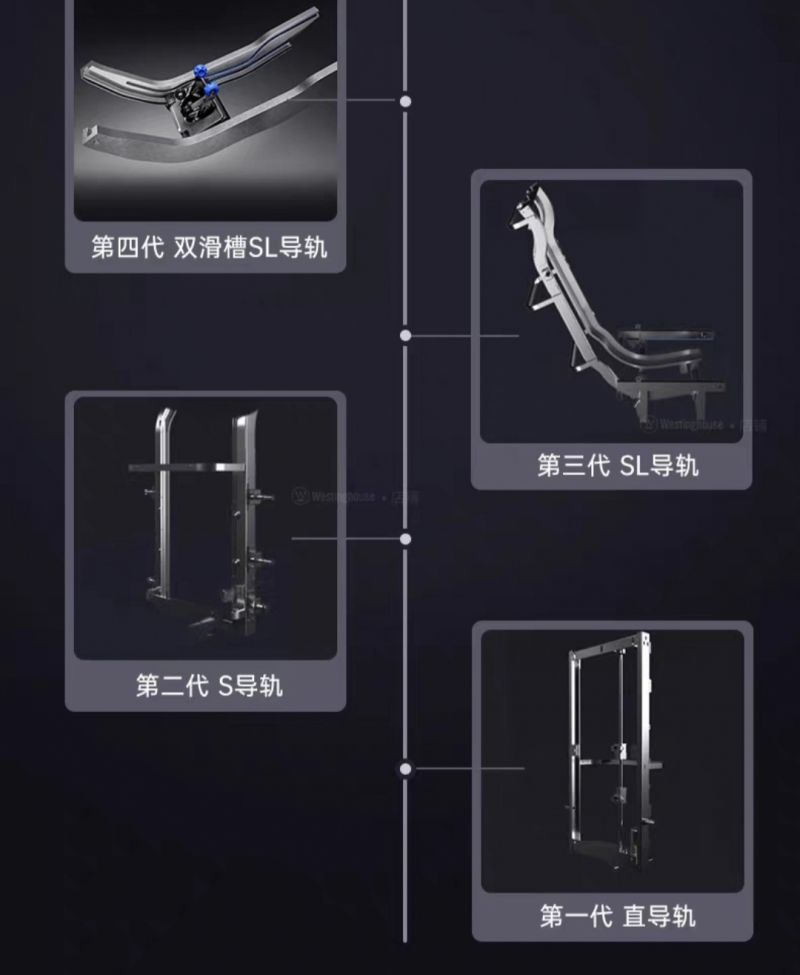 市面上主要的導軌分為直線型,S型,SL型導軌。個別廠商還推出了新概念——雙滑槽SL導軌,其實和SL型導軌沒有大多區別,反而成了掩飾機芯不足和營銷的噱頭。據我了解,有些有些品牌如西屋,設計成雙滑槽導軌實際是因為他們采用的3D機芯不能很好貼合人體肩頸曲線。因此才退而求其次選用雙滑槽,用高低兩個滑槽進行肩位調節,并不能做到如4D機芯般精準探出和貼合。