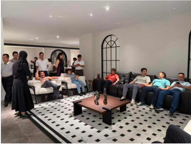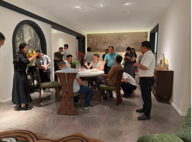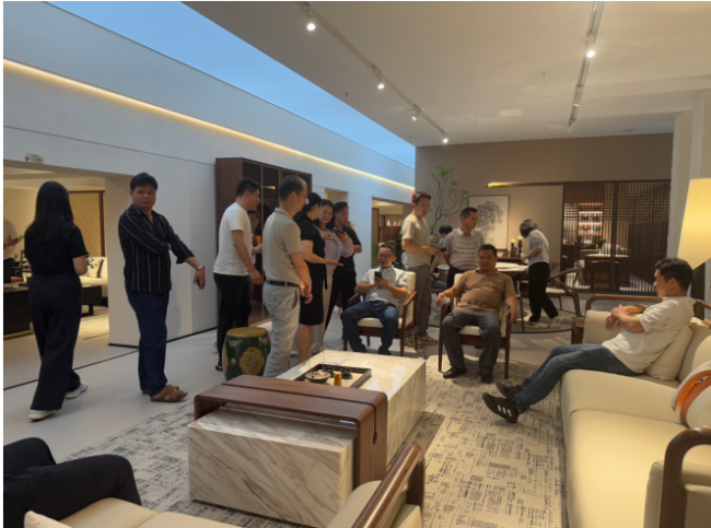 考察團一行先后走進卡琳家具展廳,沉浸式體驗以宋式美學與中古混搭風為核心的家具空間場景。從線條簡約雅致的宋式家具,到沉穩大氣、質感溫潤的中古混搭系列產品,每一處設計、工藝細節與空間布局,都充分展現出傳統美學與現代生活的完美融合。考察團邊走邊看,細致了解產品研發、材質工藝、空間搭配及品牌理念,對展廳雅致靜謐的氛圍、精益求精的品質贊不絕口。