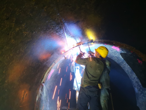 12月31日下午15:32,管道具備進入條件,可以進行裂縫修復了。打開放空閥門,眼下是無盡的黑洞,大家卻沒有絲毫猶豫,一個個排著隊來到管道中。大家舉著電筒,尋找著管道的裂縫位置。地面上的同事圍繞在閥門口外,不時地詢問管道內的狀況。“找到了!”對講機中好消息傳來,大家不敢有絲毫怠慢,查看確認無誤過后,立即匯報給現場專家組,經過專家組與我方現場管理人員討論后,當即明確修補方案,時間一刻也沒有耽誤。一聲哨響,所有施工人員集合統一安排,搬沙袋、運鋼板、接電線、裝燈帶……焊工們舉起手中的槍,剎那間,無盡的黑遭到驅趕,明亮的光芒抓住了所有人的目光。時間一點一滴流逝,水電七局人始終保持著同一個姿勢,焊槍再重,手再酸,也沒有放下,所到之處,流光四射,盛開出最美的煙火,定格出2020最美的畫面。