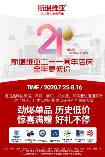 7月25日-8月16日,進口青少年家居品牌SKANVEA斯堪維亞舉辦21周年店慶。旗下丹麥青少年家具Lifetime、德國功能書桌Moll、意大利定制青少年家具Alceotumidei、意大利手工工藝家具Altamoda、比利時青少年家具Vipack、德國兒童床墊Fan等20+個品牌均參與低價讓利活動,裝點孩子們的星辰大海。