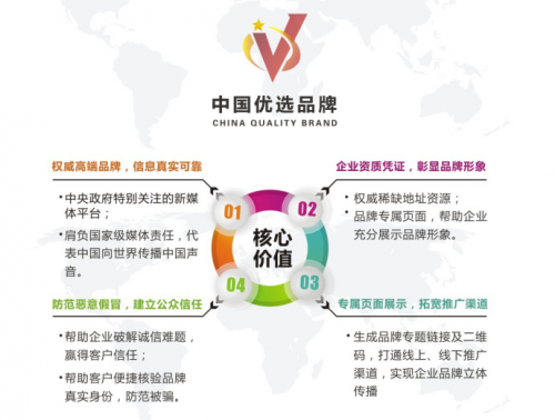 “中國優選品牌“是中國優選品牌促進發展工程聯合CCTV《發現?品牌》欄目推出的優秀品牌甄選項目。借助強勢電視、網絡媒體等自身強大的媒體資源及傳播優勢,通過媒體獨特的視角挖掘各行各業優質品牌,并整合中央電視臺以及各大視頻媒體平臺、移動客戶端等渠道,在全國各行業內篩選出優質企業,通過企業名片的形式報道在各行業作出突出貢獻、極具影響力的品牌,指導和推動更多中國企業走向品牌發展之路,將“中國優選品牌”打造成自主品牌。
