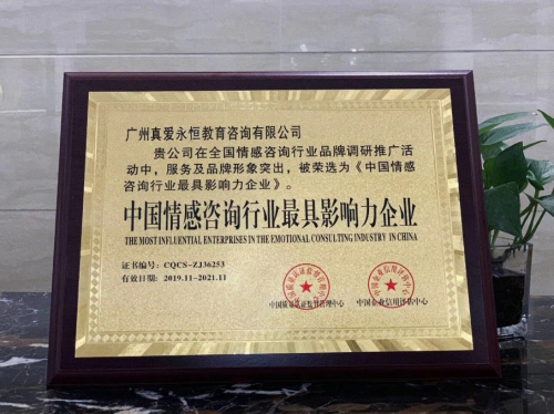 2019年5月,廣州真愛永恒教育咨詢有限公司成功被中國優選品牌促進發展工程評選為“中國優選品牌”,并授予真愛永恒“心理教育咨詢行業優選品牌”稱號。