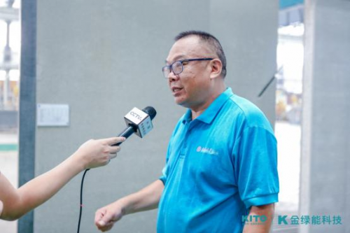 ▲金意陶董事長何乾在金綠能新材示范基地接受中央電視臺記者采訪