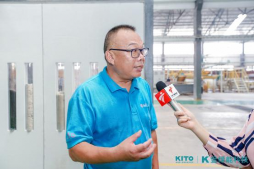 ▲金意陶董事長何乾在金綠能新材示范基地接受廣東衛視記者采訪