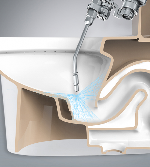 卡貝采用的是噴射虹吸式沖水,這種方式借助較大的水流將臟污推入管道內,加大了虹吸作用,加快了排污速度。池內的存水面積大,防臭、防濺的效果都很好,還降低了噪音。