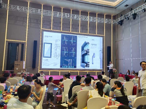 高端系統門窗廠家梵帝爾高管上臺向全場業主詳細講解梵帝爾系統窗的結構原理,其中應用的組角注膠、多道密封、雙腔體汽車級膠條、坡道式排水、多腔體結構、可拆卸防護格柵等等多項先進技術讓系統門窗更加密封防水、安全、隔音、隔熱,贏得了全場業主一片贊嘆聲和掌聲。