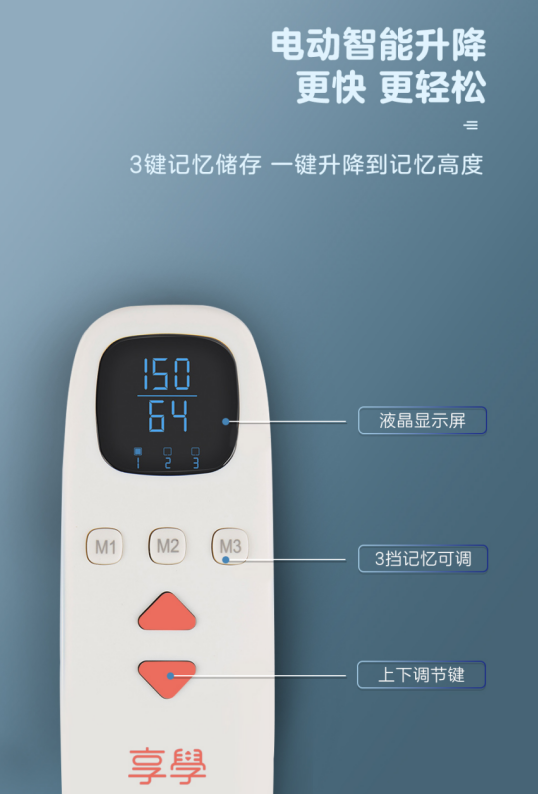 說起享學電動學習桌怎能不提及享學電動學習桌顛覆行業的“電動智能升降系統”呢。享學少年揚帆系列采用的是享學全新一代電動智能升降系統,可根據身高自動匹配無線遙控,電動升降,省時省力。學習、思考、背誦,三檔高度記憶,輕輕一按整桌自動升降,書本再多也一樣實現輕松升降,只要幾秒鐘就能切換你的學習模式。