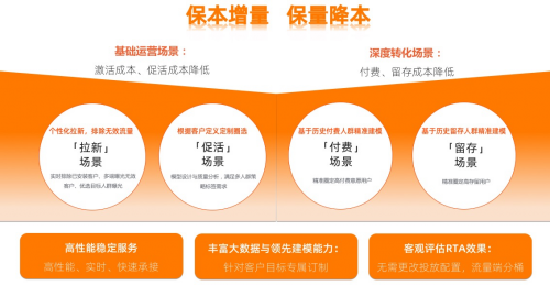 友盟+天域RTA覆蓋兩個核心場景:一、基礎營銷場景。拉新中,達到拉新激活成本降低,通過個性化拉新,排除無效流量;拉活中,依據客戶定制靈活的的“促活場景”模型設計與質量分析,滿足多策略拉活人群圈選;二、深度轉化場景,依據友盟+天域RTA獨有的優勢,深度轉化以及后鏈路數據場景,如付費、次留等可實現保量降本的效果。