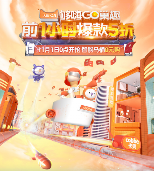 雙十一當天,卡貝重磅推出“爆款5折”和0元送活動。11月1日0-1點,爆款5折;11月1日0-1點,前50名智能馬桶(MAT8006-DP)免單,而在7-24點期間,每小時下單金額最高的則贈送價值399元的微壓麥飯石不粘鍋。