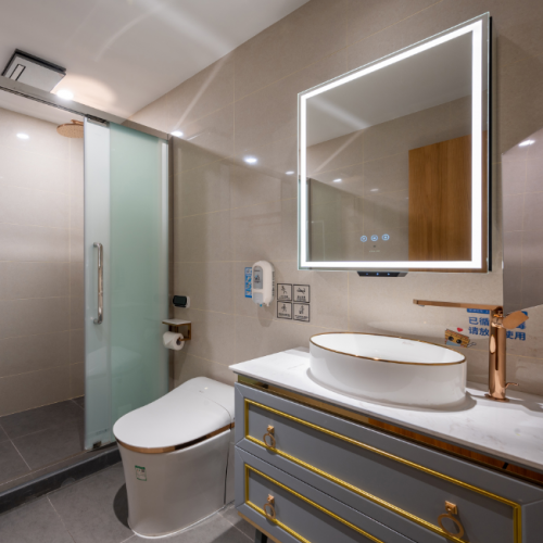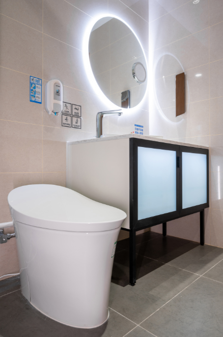 因應藝術家們在上臺表演前的專業妝發需求,科勒還在VIP化妝間特別安裝了維亞鏡子(云智能版),內建環繞式感應燈光以及專業美妝照明功能,可以設置不同色溫以模擬舞臺環境光線,讓妝容更加生動且精準。搭配維亞智能一體座便器、維亞綺美石時尚臺盆(智能燈光版)、維亞浴室柜(智能燈光版),組合成一整套先進的衛浴設施,使空間兼具顏值與實用性。演員們即使身著華麗繁復的演出服,也能輕松完成如廁梳洗。維亞浴室柜柜底自帶感應功能,用腳輕掃即可感應切換浴室柜柜門透明度,方便演員迅速確認柜內物品,更高效完成演出前的準備工作。