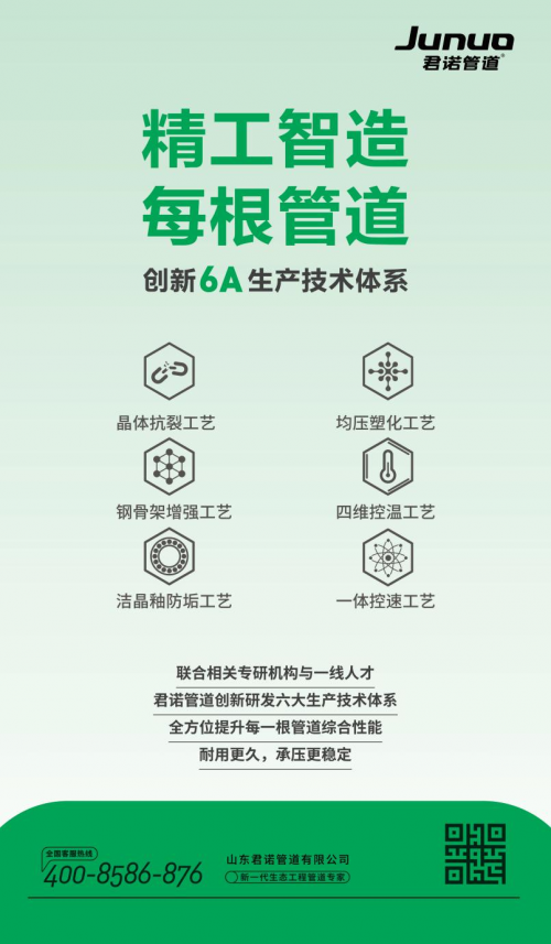 除此之外,依托自身強大的研發生產實力與技術實力,君諾管道為最大程度保障產品質量,投入了大量資源,自建五星生態管道品質保障體系,由專業團隊負責,通過數百項嚴苛標準,嚴格監管生產研發、供應鏈、生產流程、技術工藝、品質檢測五大系統,嚴苛細節,層層把控,保證每一項生產環節的精細化、標準化、高品質化,以高于行業標準的生產技術,精耕細作,賦予每一根生態工程管道穩定的品質。