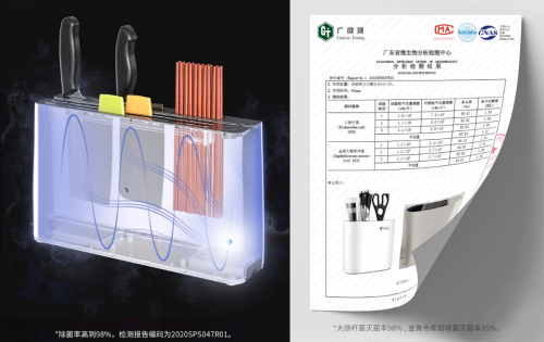 使用起來并不復(fù)雜,把刀具筷子放進去之后,輕觸頂部的按鈕就能開始工作,一鍵式操作,簡單快捷,上手就會。這款刀架里面裝配的是高性能的UV紫外線燈,使用安全,滅菌高效。根據(jù)廣東微生物分析檢測中心的報告來看,大腸桿菌除菌率高達98%,金黃色葡萄球菌除菌率高達95%。