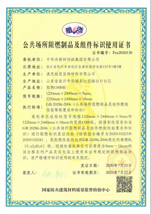 通過國家防火建筑材料質(zhì)量監(jiān)督檢驗中心檢測,獲得公共場所阻燃制品及組件標識使用證書。