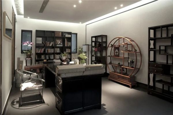 書房主調與客廳一致,淺色的墻搭配深色木質書桌和書架,使得整個房間顯得特別古色古香。