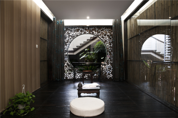 正對樓梯的一個空間,仿照園林月亮門,可以讓室外風景、綠植與室內溝通,圓窗邊的填充虛實相間,將室外的光影變幻傳達進來。