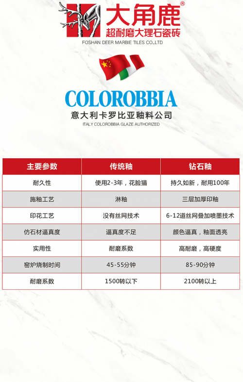 眾所周知,在家庭使用過程中,常常受到堅(jiān)硬物體的摩擦,導(dǎo)致瓷磚表面很容易被磨花,污水會(huì)隨著劃痕滲透進(jìn)去,導(dǎo)致瓷磚花色暗淡、模糊,更有甚者,導(dǎo)致花色變色。然而,這一問題早已成為常態(tài)時(shí)刻困擾著瓷磚行業(yè)。為了解決瓷磚不耐磨、易刮花的問題,大角鹿首先提出超耐磨大理石瓷磚概念,與世界的第一釉料公司——的意大利卡羅比亞釉料強(qiáng)強(qiáng)聯(lián)手合作,研制出獲得國家專利的“超耐磨鉆石釉”技術(shù),成功打造出全球首款超耐磨大理石瓷磚。