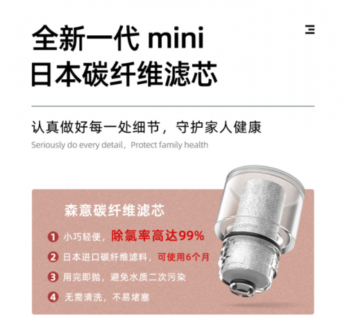 小巧精致的森意M01B碳纖維凈水器,不占空間,對于租房黨、小戶型很友好。采取超小機身設計,空間小也能放得下,不必擔心安裝空間不足問題,并且還有足夠空間放置其他物品。嬌小身材里,隱藏著卓越的凈水實力。它采用了采用日本進口碳纖維濾芯,精細化濾水,有效濾除水中雜質、重金屬、和余氯等有害物質,讓每一滴水都健康放心,確保出水水質可以直接飲用。