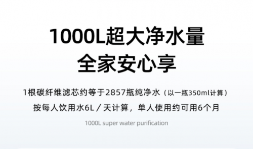 大容量暢想鮮活水源森意M01B碳纖維凈水器濾芯壽命高達1000L。滿足我們淘米、洗菜、做飯、洗碗等一系列用水,為家庭飲用水體驗帶來飛躍式提升。真正做到隨時都可飲用鮮活好水,時刻呵護家人用水健康,單人使用約可用6個月,是節水型社會的優先選擇!