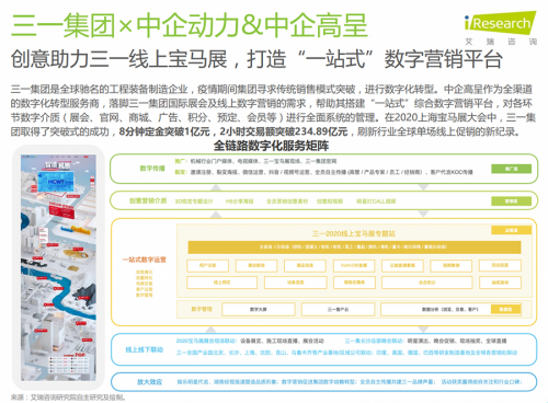 在艾瑞咨詢發(fā)布的《2020年中國企業(yè)數(shù)字化轉(zhuǎn)型路徑實踐研究報告》中,中企高呈作為一站式數(shù)字化轉(zhuǎn)型服務(wù)商入選2020中國企業(yè)數(shù)字化轉(zhuǎn)型服務(wù)產(chǎn)業(yè)圖譜。同時,《報告》收錄了中企高呈打造的“創(chuàng)意助力三一線上寶馬展,打造‘一站式’數(shù)字營銷平臺”應(yīng)用案例 , 為企業(yè)數(shù)字化轉(zhuǎn)型提供更多實踐參考,充分展現(xiàn)中企高呈在全鏈路數(shù)字化轉(zhuǎn)型服務(wù)領(lǐng)域的突出能力和行業(yè)代表性地位。
