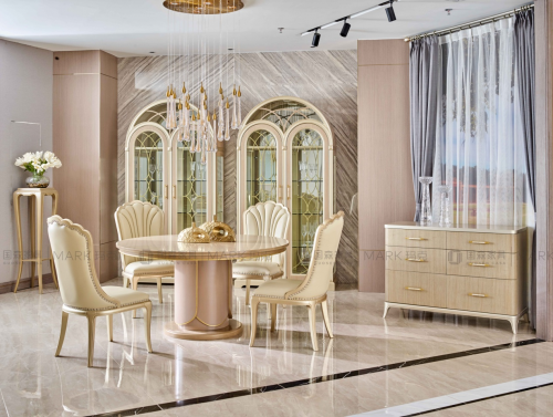 同時(shí),金屬、皮革及木質(zhì)的結(jié)合讓家具顯得不這么笨重,有了輕盈且時(shí)尚的既視感。以瑪克系列的餐桌設(shè)計(jì)為例,整體呈現(xiàn)出精致優(yōu)雅的輕奢美式氛圍,讓用餐時(shí)刻變得明媚精彩起來(lái)。金屬的光澤感與設(shè)計(jì)交融,憑借著其閃亮華麗的特質(zhì),煥發(fā)出迷人的魅力,形成跨時(shí)代的現(xiàn)代美式風(fēng)生活理念。
