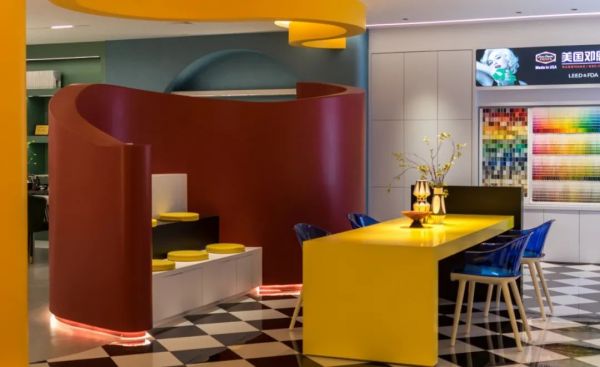 項目是一個150㎡的展廳,展廳內需要容納兩個品牌,以低飽和度色彩為主的Easydeco易涂得藝術涂料,和以鮮艷純色為主美國鄧恩涂料,并同時兼容展示、洽談、休閑和產品實驗等功能區域。