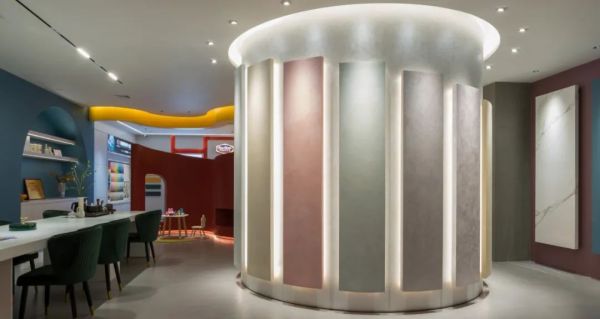 處于展廳中心位置的圓形獨立空間,專門設置了沉浸式產品試驗區,通過多重手段對比、分析,給客戶全新的購物體驗。沉浸體驗區的外墻面為材料展示提供了絕佳空間,結合商業空間設計可持續的大命題,張天將藝術涂料展示在一塊塊浮起的石膏版上,極大的方便了后期更換展示商品。涂料展示板排列高低有序,燈光恰到好處地勾勒出紋理,傳統的展示墻面被賦予了靈動之美。
