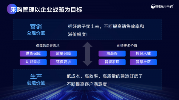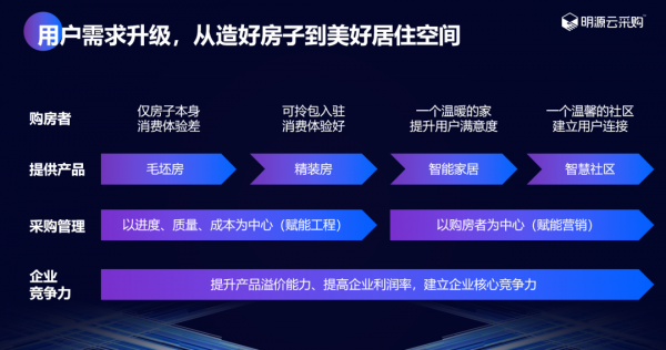 從采購管理的角度來看,其實是以進(jìn)度、質(zhì)量、成本為中心的賦能工程,到以購房者為中心的賦能營銷的升級,助力開放商更快的打造好房子,為購房者提供高價值產(chǎn)品,讓營銷變得更簡單。