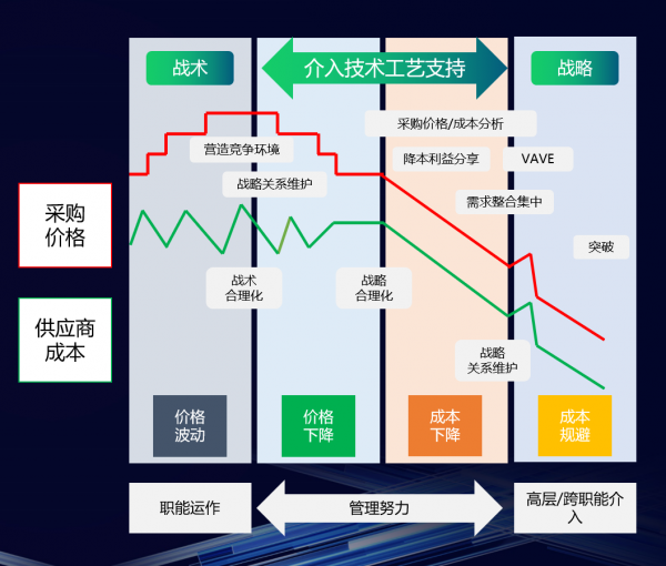 戰(zhàn)略階段:即成本規(guī)避階段。這個階段需要高層或者跨職能的介入,開展規(guī)避非價值產(chǎn)出的采購活動,若采購的物料或服務(wù)不能為最終購房者產(chǎn)生價值,盡量減少非價值創(chuàng)造的采購活動。