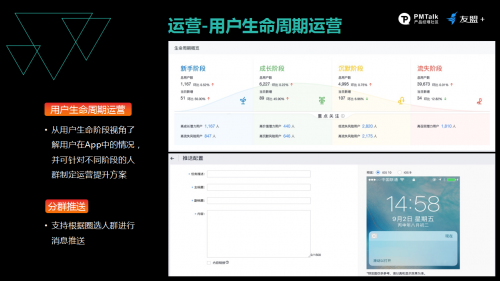 在友盟+的平臺上,公司或個人可通過U-APP移動統計輕松了解用戶生命周期,可發現目前APP里有多少用戶是新人,多少用戶是在沉默狀態,又有多少用戶流失了。然后就可以通過活動連接新手階段的用戶,設法讓他們逐步到達成長階段,也可以激活沉默狀態的用戶,避免這部分用戶流失。
