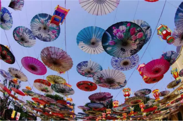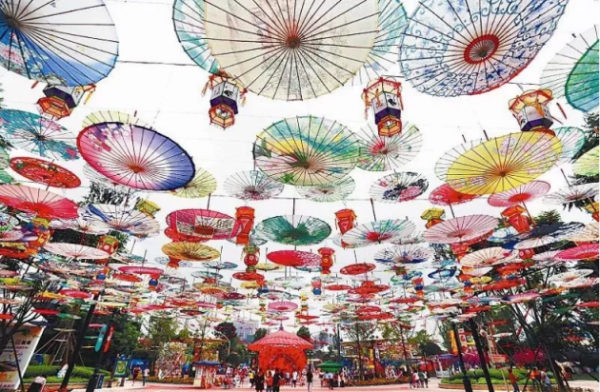 數把水墨油紙傘與綻放荷花遙相呼應,