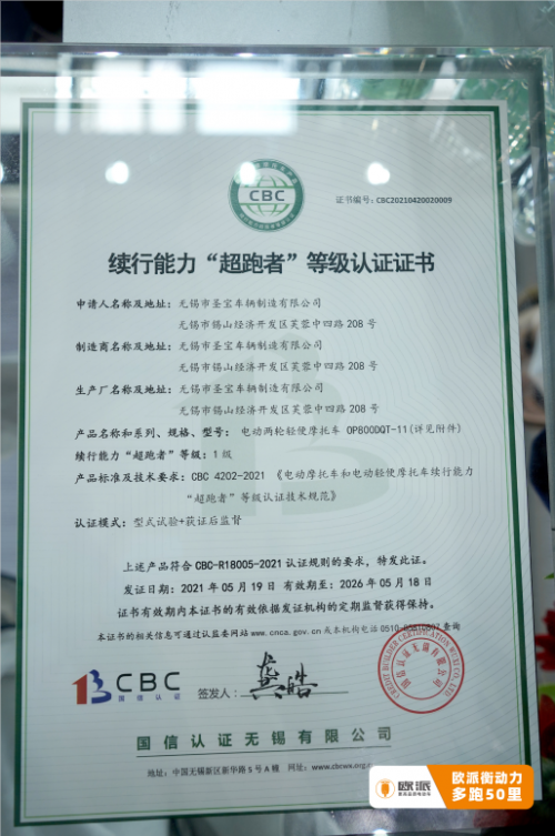 始終致力于為人們打造美好出行體驗的歐派電動車一直是行業大獎的“常客”,在無錫展現場,歐派電動車再一次得到了行業的充分認可,榮獲了由CBC認證的續行能力“超跑者”等級認證證書。歐派電動車能夠獲此殊榮也不足為奇,畢竟歐派科技的科研團隊有著相當豐富的前沿技術儲備,這也正是歐派電動車掌握國家專利省電技術、擁有多項發明專利的主要原因?,F在,歐派電動車以續行能力“超跑者”的身份,為廣大用戶帶來更高品質的出行體驗。