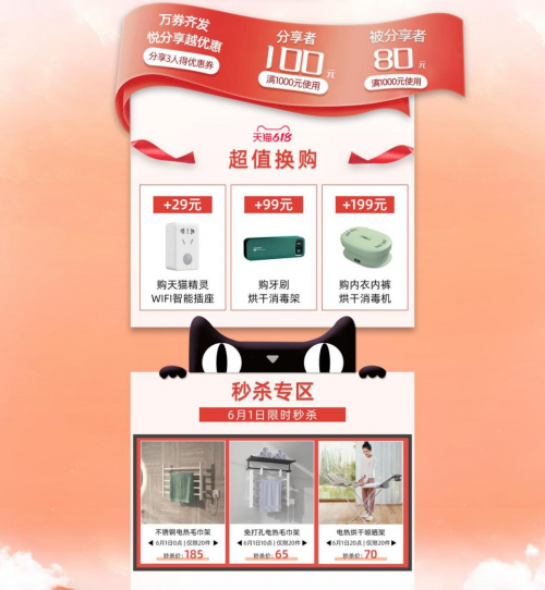 同時,SHARNDY想的店鋪還推出了爆款產(chǎn)品限時折上折,ETW12-11W、ETW29P、晾衣架、ETW12-6RM黑色等產(chǎn)品可以在領(lǐng)券基礎(chǔ)上,再享9折;還有加29元換購天貓精靈、wifi智能插座;加99元換購牙刷、烘干消毒架;加199元換購內(nèi)衣內(nèi)褲烘干消毒機等超值換購活動。