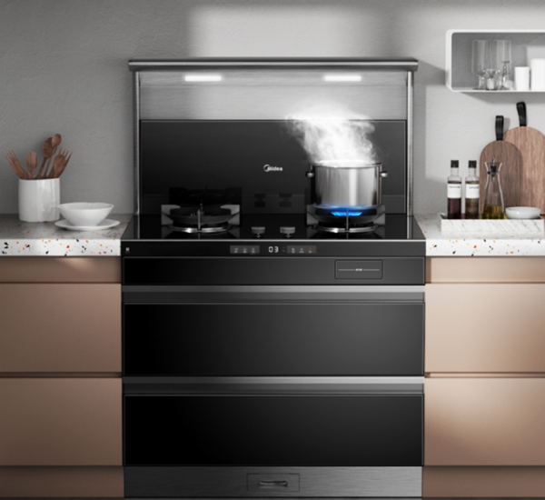 美的蒸汽洗集成灶D14S集油煙機、燃氣灶、消毒柜、儲藏柜、置物臺于一體。在擁有上述必要功能之外還具備66L的儲物空間,碗盤收納也能輕松解決。多功能集成一體,高效便捷使用不占面積,最大程度充分利用廚房空間,讓更多廚房用品有處安放。