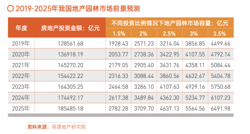 下游房地產(chǎn)行業(yè)的需求變動直接影響地產(chǎn)園林景觀的市場 發(fā)展。未來,房地產(chǎn)市場的持續(xù)增長將繼續(xù)帶動地產(chǎn)園林景觀 業(yè)務(wù)的市場擴(kuò)張。2015年以來我國房地產(chǎn)開發(fā)投資規(guī)模增速回 落明顯,預(yù)計2019-2025年間我國房地產(chǎn)開發(fā)投資增速維持在 6.4%左右,根據(jù)園林綠化行業(yè)經(jīng)驗,地產(chǎn)項目配套景觀園林投 資占到地產(chǎn)總投資額度的1%-4%。根據(jù)測算,2020年我國地產(chǎn) 領(lǐng)域的園林景觀市場規(guī)模在2000~4500億元之間。