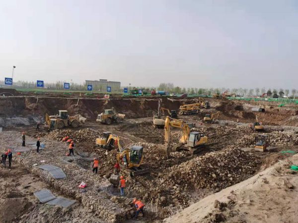 2月底文物勘察的介入,幾乎讓工程陷入停滯狀態(tài)。項目改變思路,多點出擊。避開文勘區(qū)域,間隔開挖,充分利用每一段可以施工的區(qū)域。同時為了加速文勘工作推進,為工程贏得時間,項目分別先在文勘階段派出100多人協(xié)助,一米一米的將施工全線探查過去;后在文物發(fā)掘階段,派出5臺挖機和80人的隊伍配合發(fā)掘。終于將文物發(fā)掘工作時間壓縮到最短,為項目爭取了寶貴的施工時間。